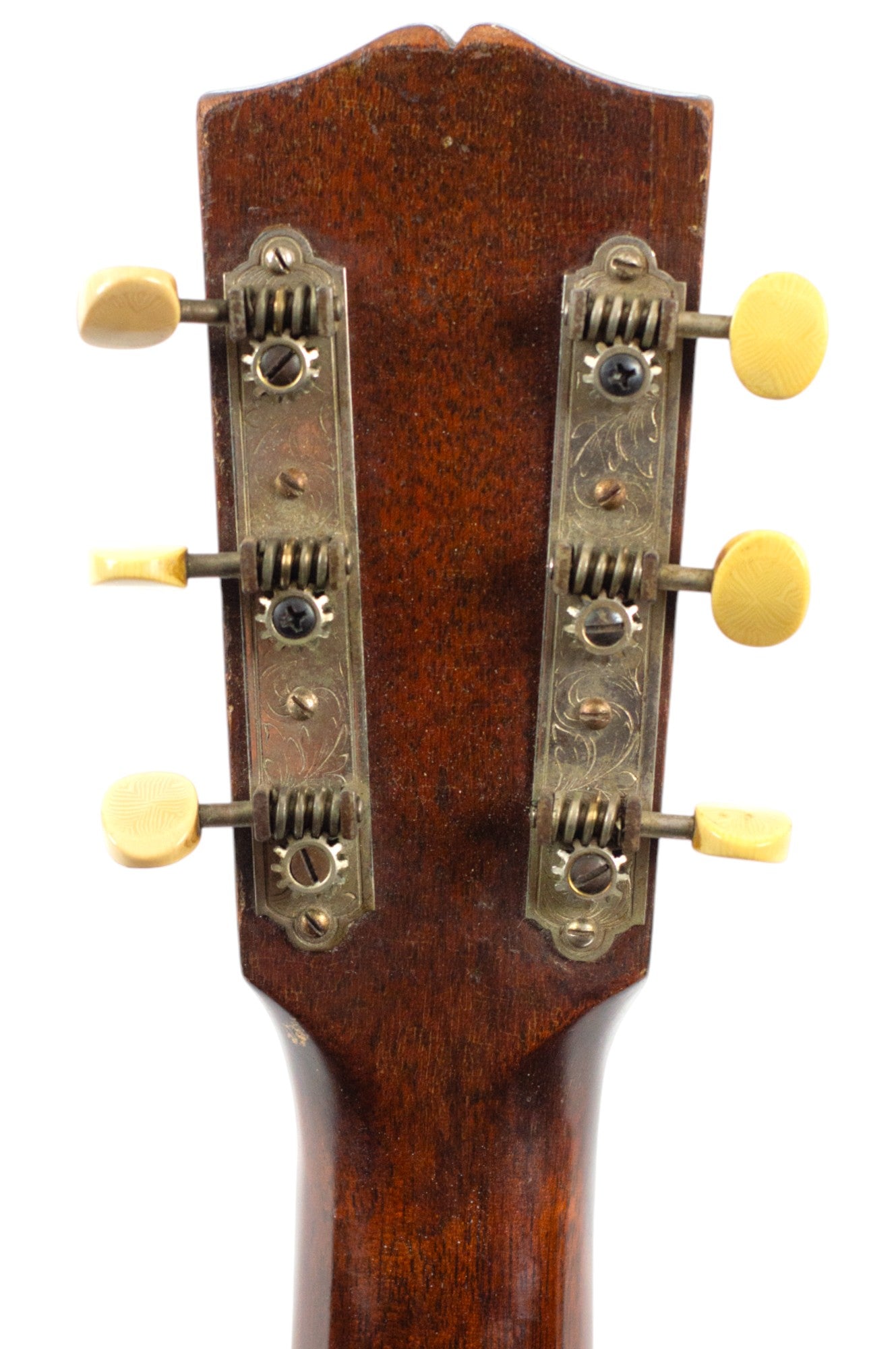 There are a number of repairs to the instrument but everything is structurally sound. Small patch on top above the soundhole. A large back crack has been glued and cleated. Several side cracks, on the bass side, have also been glued and cleated. The bridge has been replaced, a new Maple bridgeplate added, and the original trapeze tailpiece has been removed. Small finish shadow from removed tailpiece.