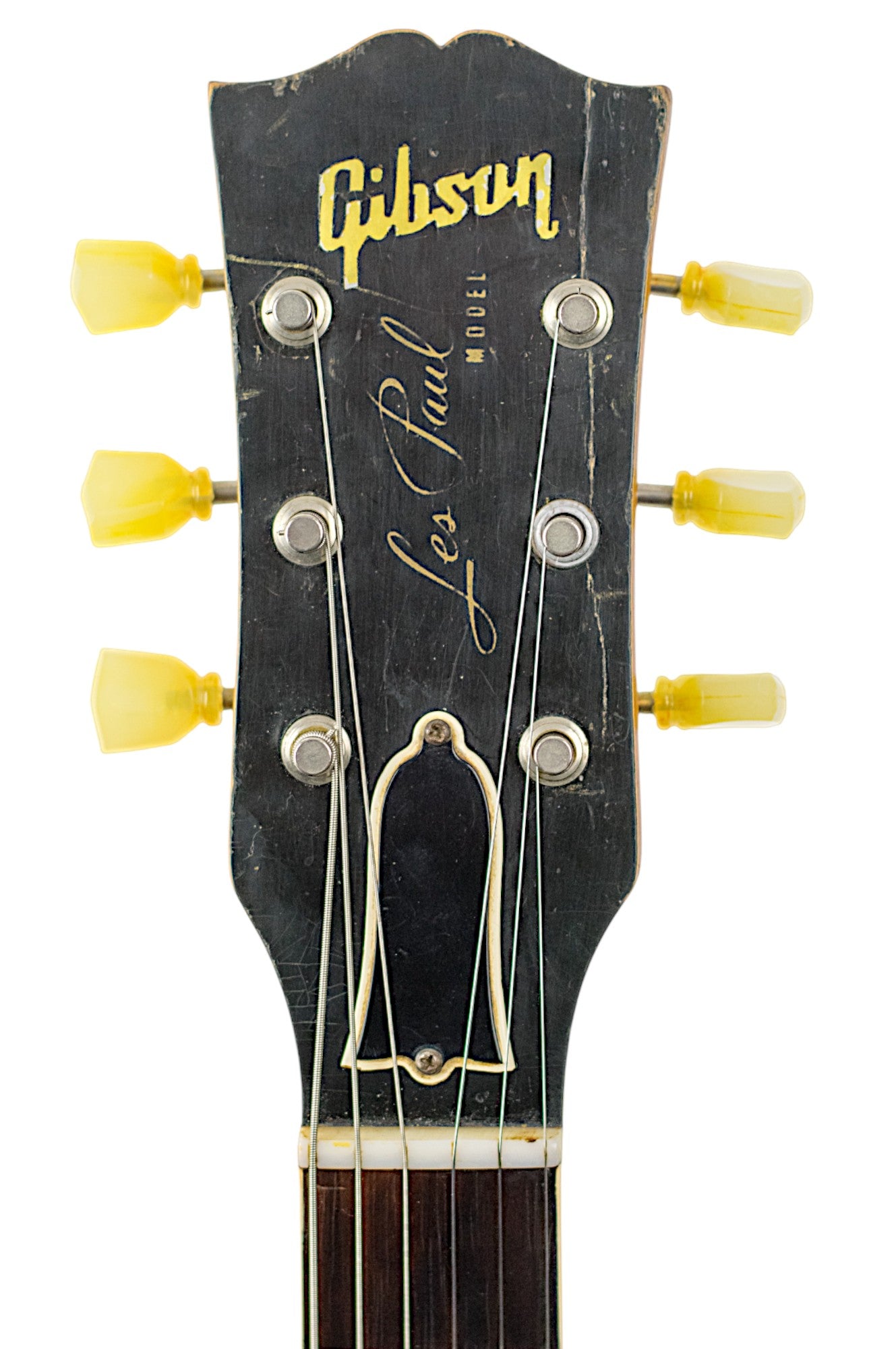 The guitar has a 1953 Les Paul body and neck which have been "converted" to a 1957 style Les Paul. The 1953 body was routed for humbuckers and a set of vintage PAF humbuckers of unknown provenance was installed. There are a number of other repairs and mods. The neck was previously reset. The treble side headstock wing was repaired at some point. We added a period correct Toggle switch and wire because the existing switch was not functional. The frets are low but were dressed in our shop to improve playability. The pickup covers were removed and reinstalled. The jack plate has been replaced.