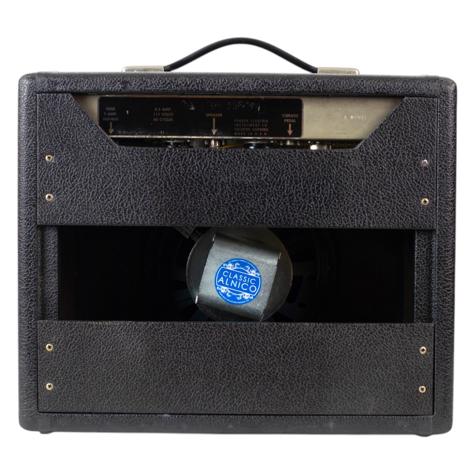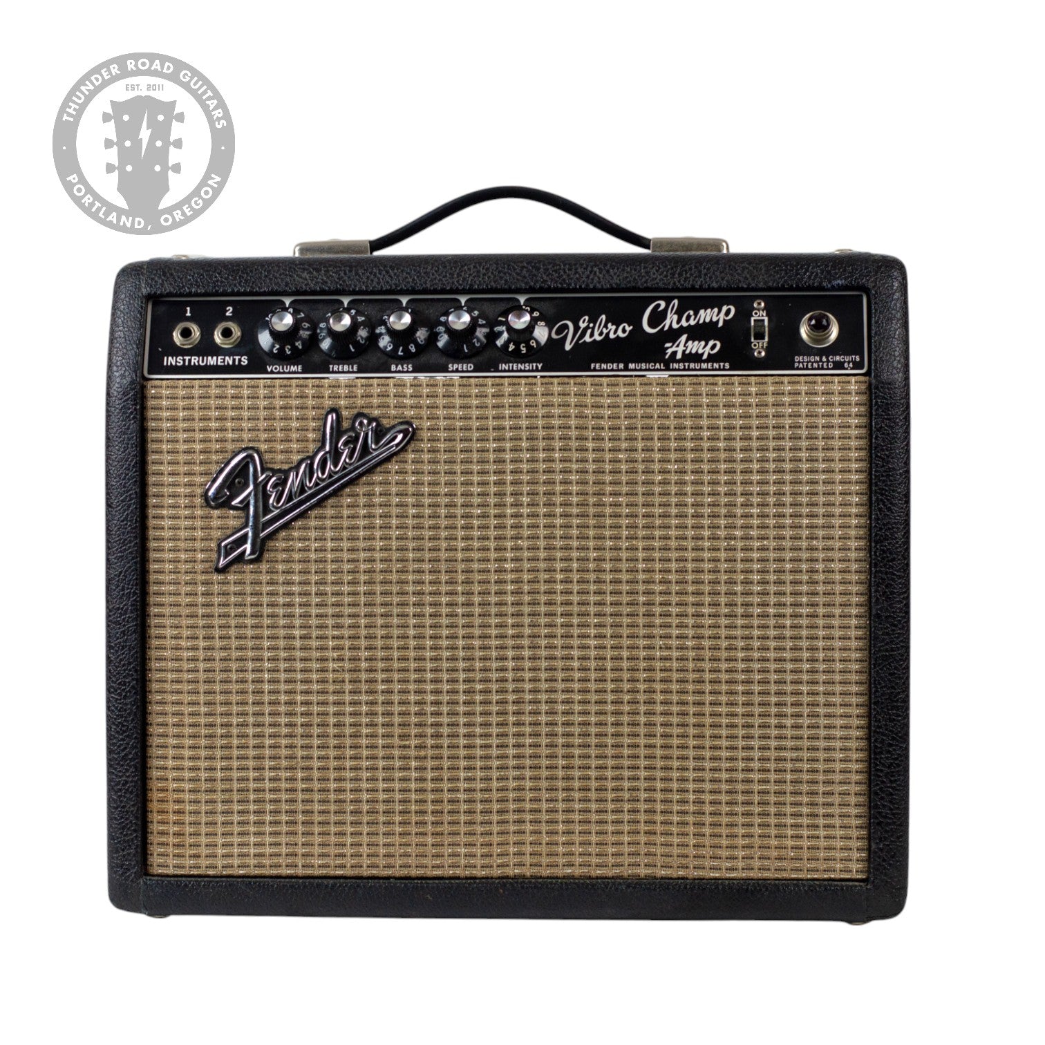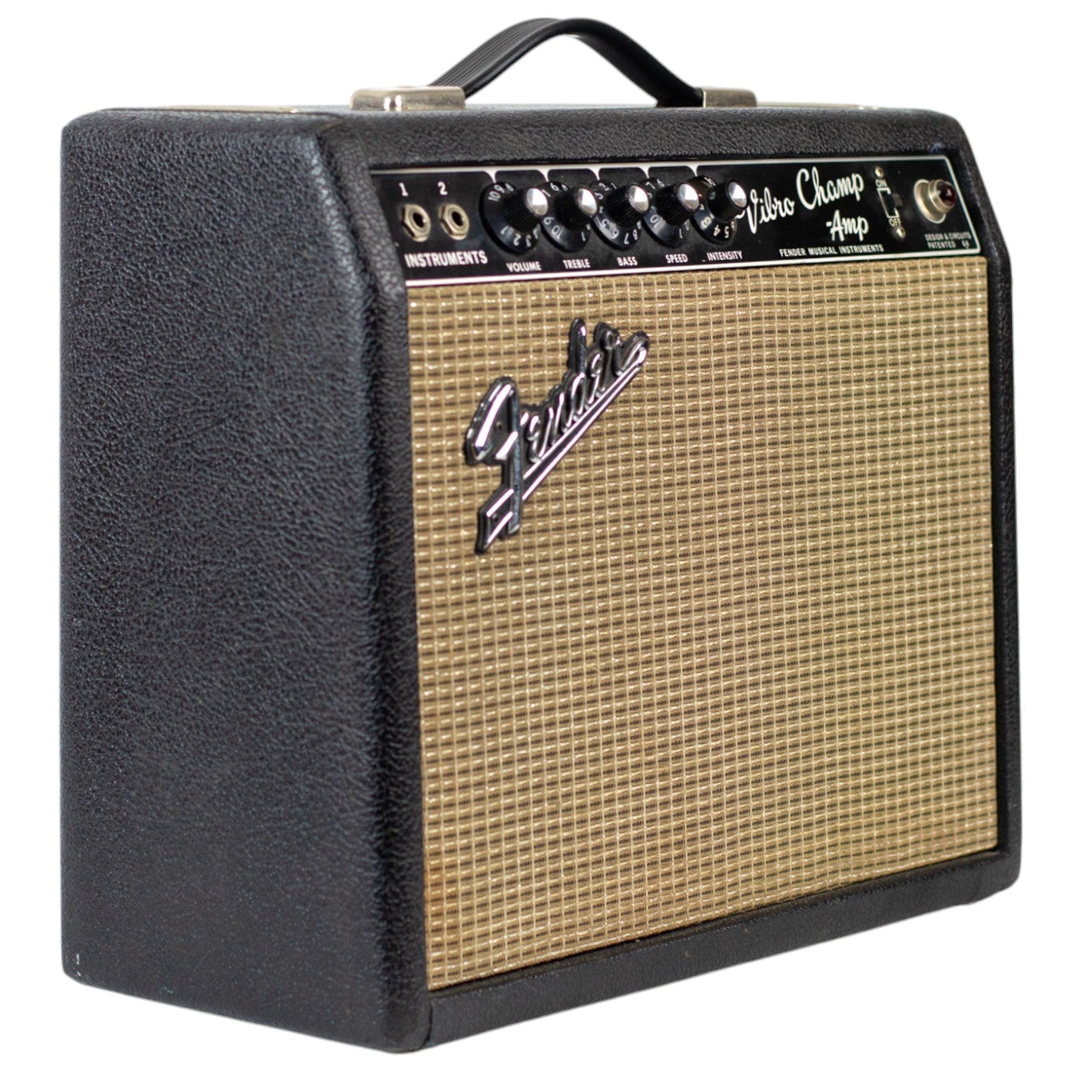 Fender overhauled the Champ in fall 1964 in the “blackface” style—black Tolex covering and black front-mounted control panel with separate bass and treble controls. The tube layout remained the same. 1964 also saw the introduction of model with built-in tremolo called the Vibro Champ. Along with the rest of the Fender amp lineup, the Champ and Vibro Champ adopted the “silverface” style in 1968.