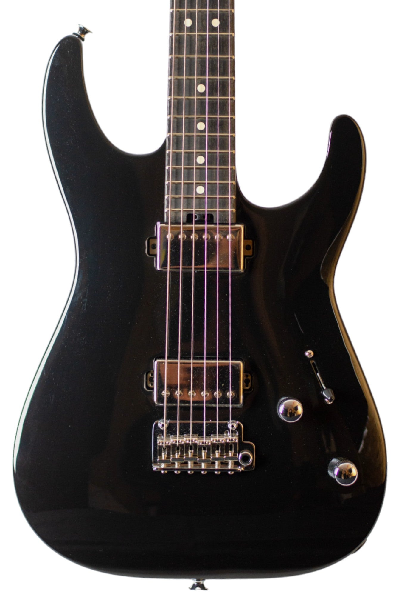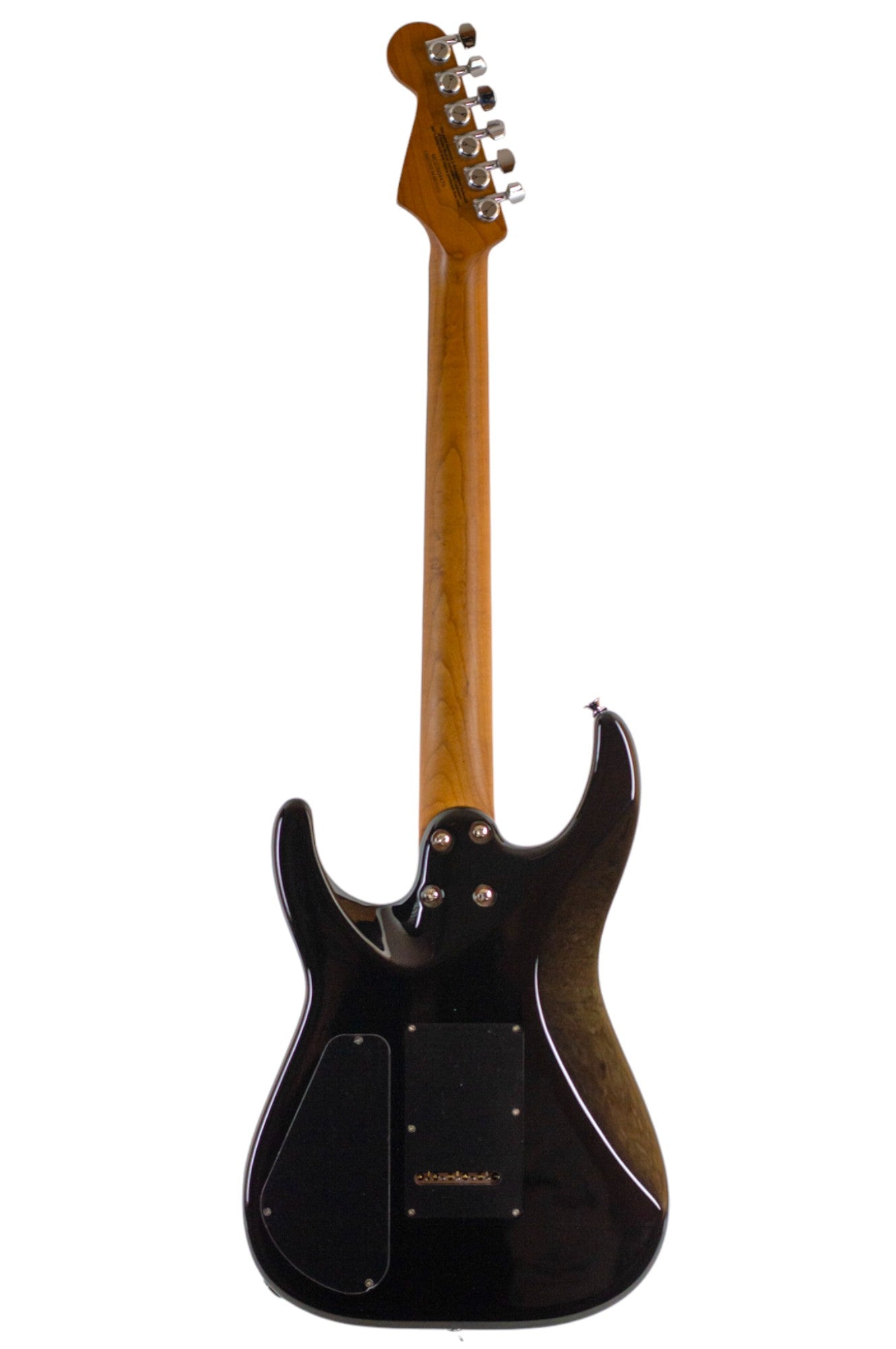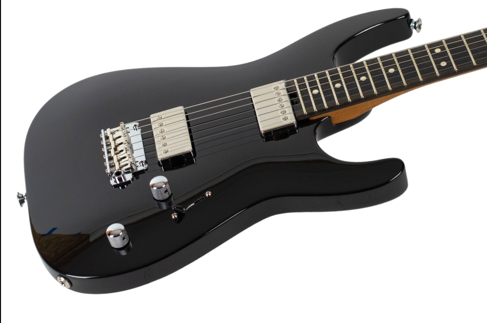 This limited edition Charvel® Super-Stock DKA22 HH 2PT EB comes with an arch body is fashioned from alder and features an elegant black gloss finish. The bolt-on caramelized maple "speed" neck has graphite reinforcement, a silky-smooth hand-rubbed urethane finish, and is topped by a 12"-16" compound radius ebony fingerboard with comfortable rolled edges, 22 jumbo frets and crème dot inlays. A licensed Stratocaster® 6-in-line headstock completes the unique look of this Super Stock axe.