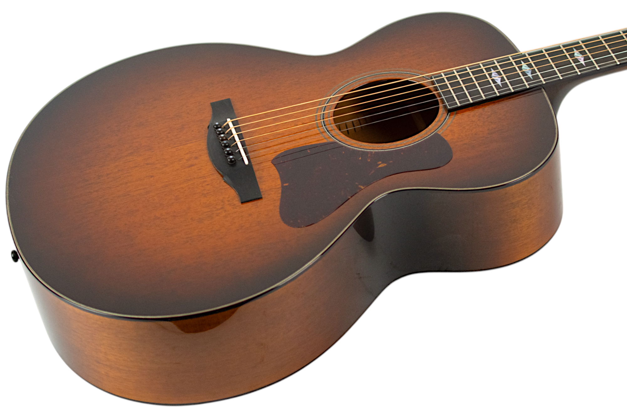 The SJ is our version of what is commonly called a Small Jumbo. Although the 16-inch lower bout is slightly wider than a dreadnought, and the sides almost as deep, the tight curve at the waist creates in a very different sound chamber. SJs, especially examples in maple, typically have a more pronounced midrange response when compared to a dreadnought, making them ideal candidates for a rounded cutaway. Players looking for the bass and overall volume of a large guitar, but with lots of treble clarity and midrange crunch, often find just what they need in the curvaceous SJ.