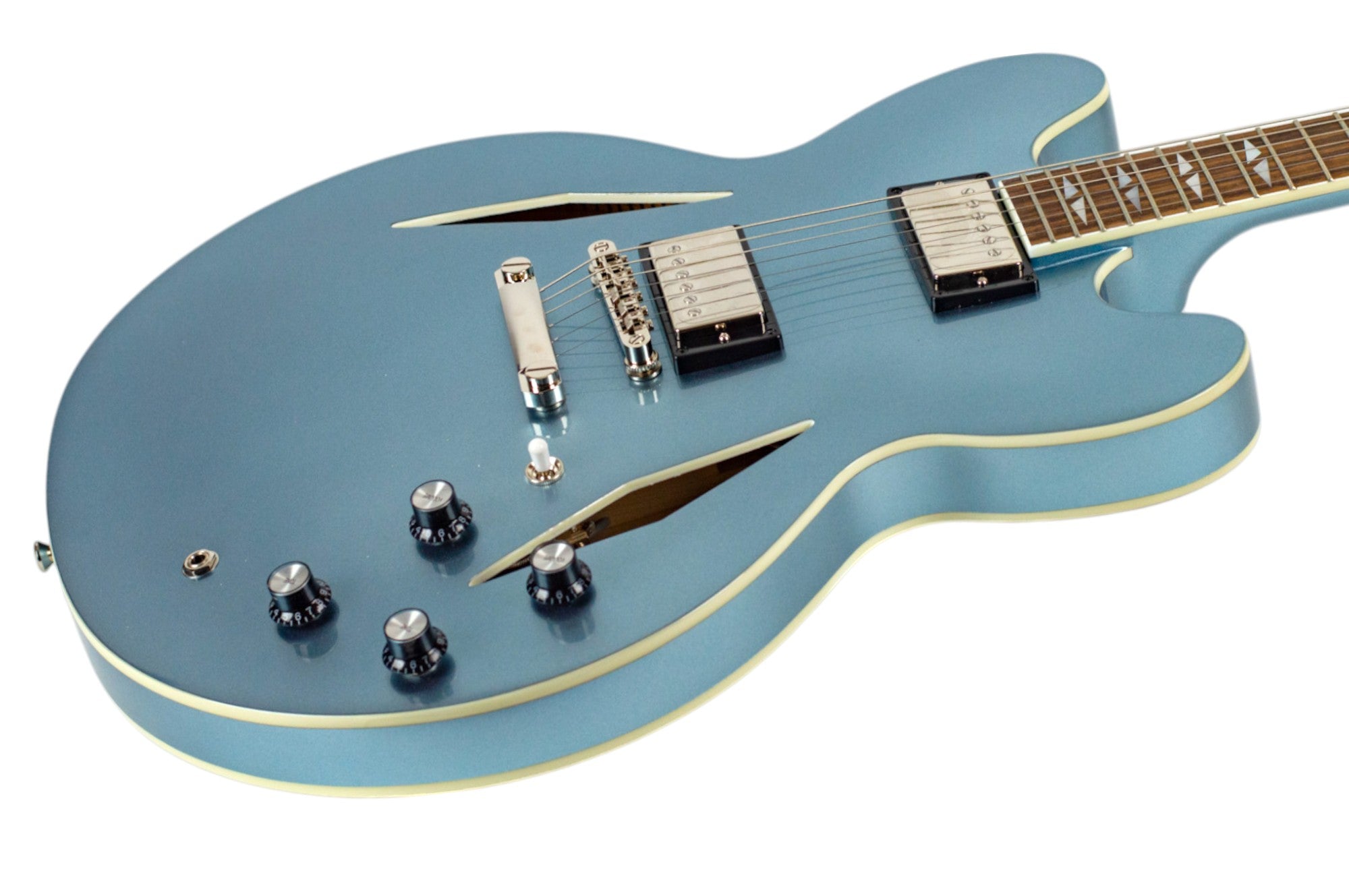 Layered Maple/Poplar Body in Pelham Blue Gloss Finish with White Bound Top, Back, Fingerboard, and Sound Holes