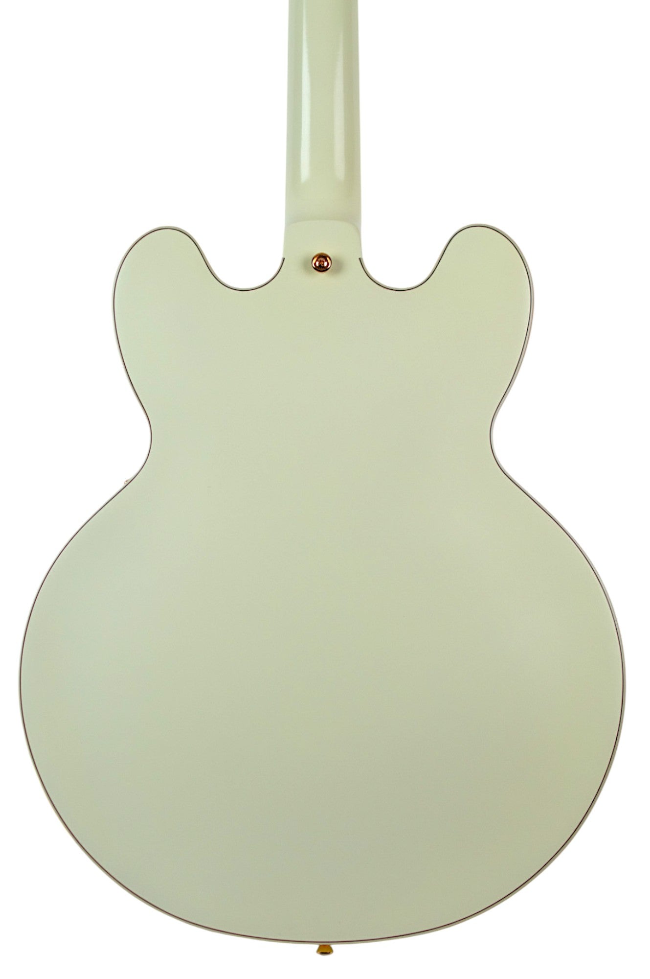 The 1959 ES-355 features a 5-ply layered maple/poplar body with a solid maple centerblock for sustain and feedback resistance, a one-piece mahogany neck with a 50s Rounded Medium C profile, and an ebony fretboard that is adorned with block mother of pearl inlays. The Gibson-style “open book” headstock features the Split Diamond and Epiphone logo inlays in mother-of-pearl, along with gold Grover® Rotomatic® tuners and the Inspired by Gibson double diamond logo etched on the back.