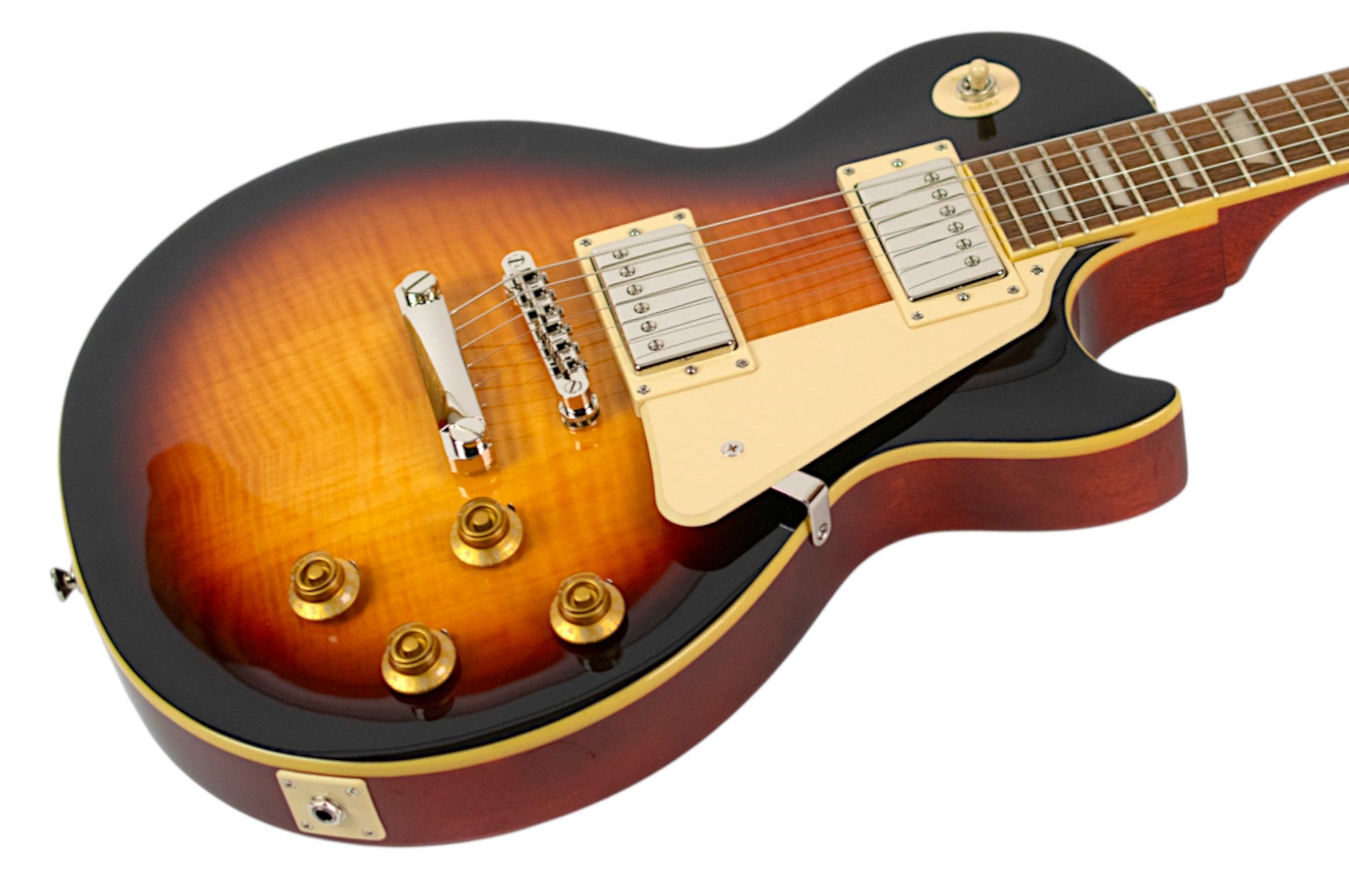 This guitar is crafted with a mahogany body, maple cap with AAA flame maple veneer, bound ’59 Rounded Medium C-shaped mahogany neck with long neck tenon, laurel fretboard with classic trapezoid inlays, Epiphone’s Vintage Deluxe tuners, a pair of critically acclaimed Epiphone Probucker™ humbuckers™, and gold Top Hat knobs with dial pointers. This Epiphone Inspired by Gibson Original model also has the Kalamazoo headstock, Graph Tech® nut, era-appropriate wiring, and CTS® pots. A premium gig bag is also included.