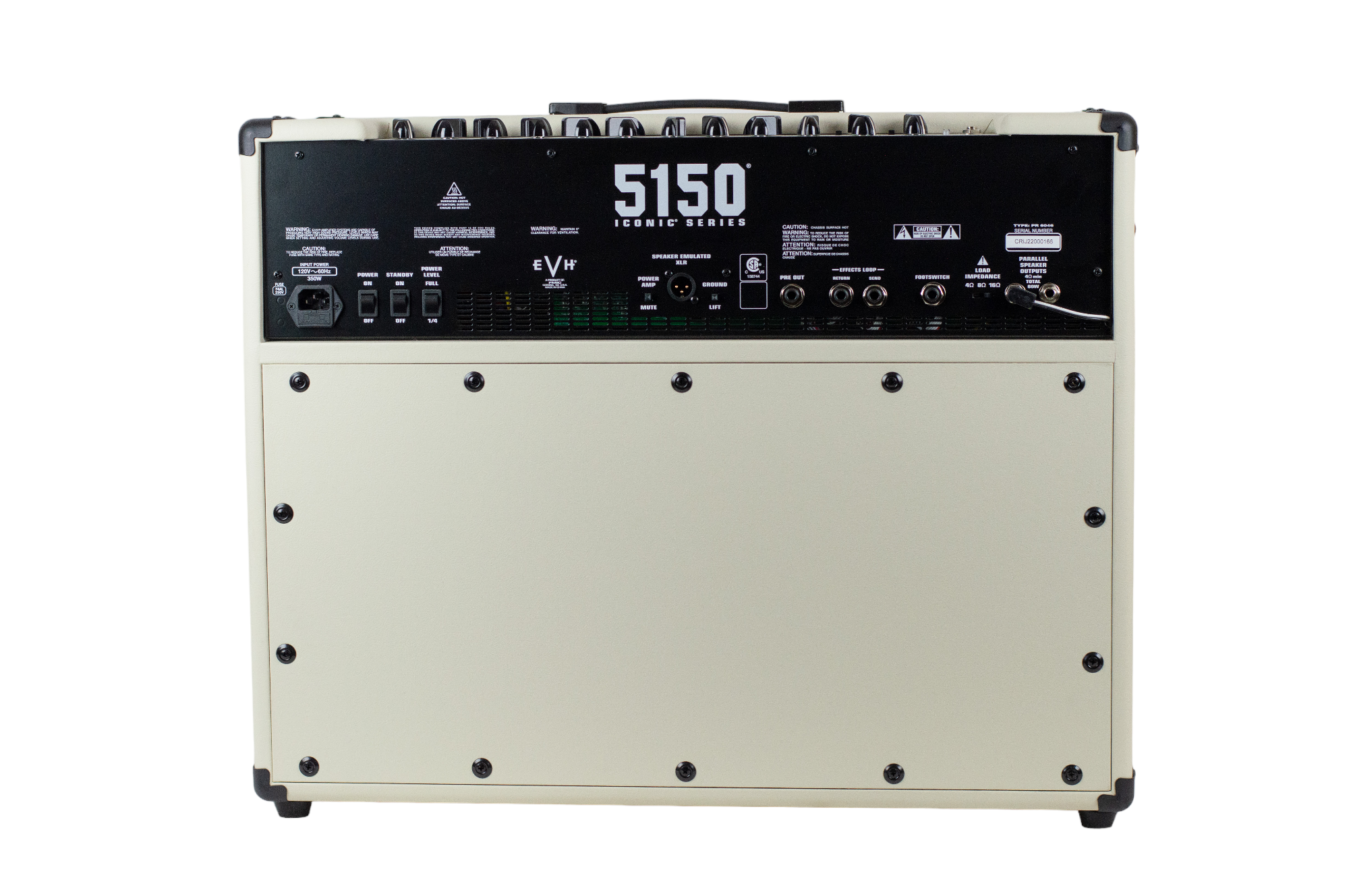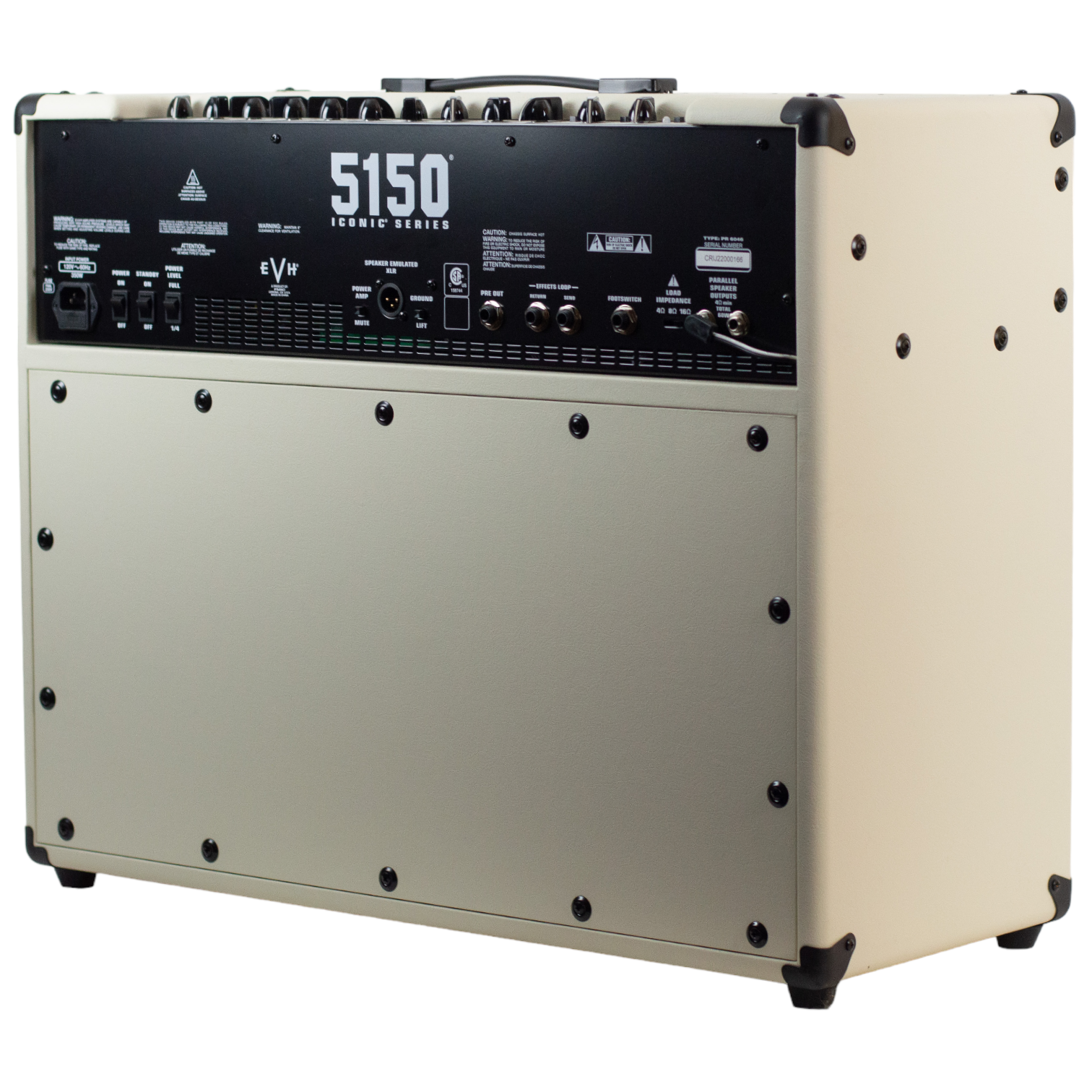 Sporting distinctive EVH style, the 5150 Iconic Series 60W 2x12 combo is wrapped in either Black or Ivory textured vinyl with a black cloth front grille and features silver and black 5150 and EVH logo badges in the upper left and lower right corners. This all-tube combo is finished off with a brushed aluminum top panel, vintage-style chicken-head knobs and molded black plastic top handle. A high-quality fitted cover is available as an EVH Accessory.