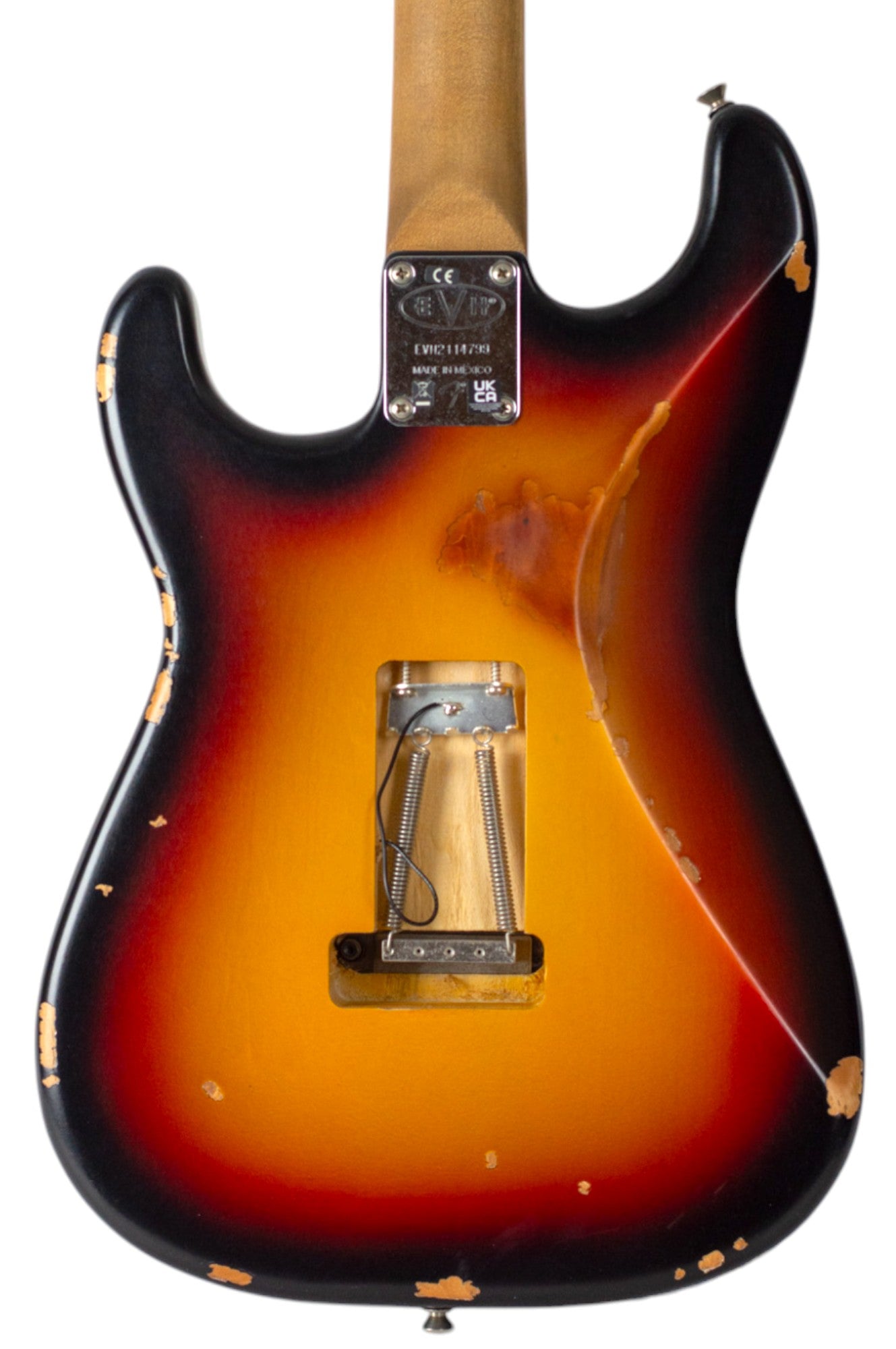 There are very few guitars out there that are as famous as Eddie Van Halen's favorite 6-string sidekick, lovingly known as "Frankenstein." This guitar was Eddie's attempt to combine the sound of a classic single-cut solid body guitar with the physical attributes and tremolo bar functionality of a Fender Stratocaster. The EVH Frankenstein "Frankie" Series is a civilian variant of Eddie Van Halen's iconic red, black, and white Frankenstrat guitar - complete with a worn-in relic'd finish.