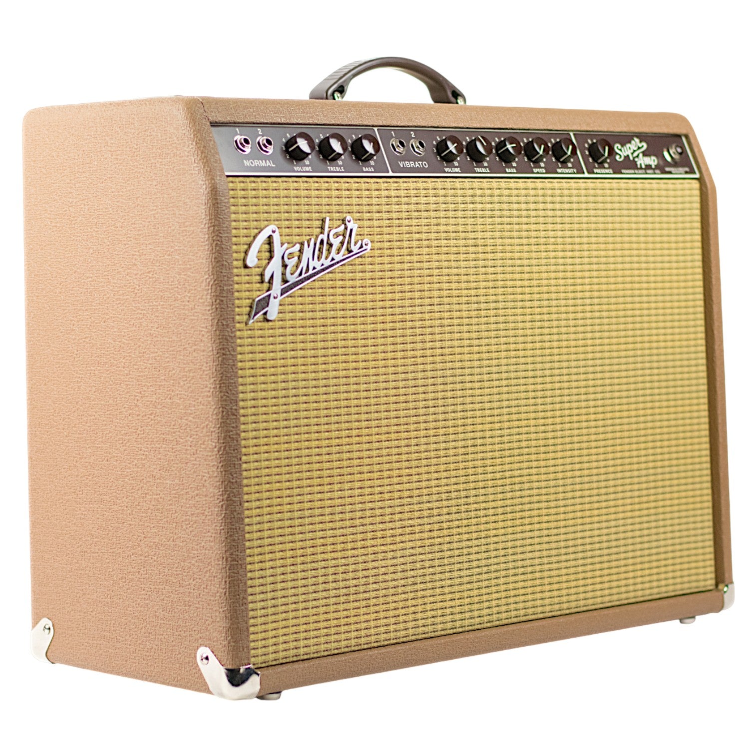 The first of the Fender® brown panel models, the '62 Super™ has an incredibly warm and woody sound when played clean blooming into sweet overdrive when cranked. Along with its special phase-shifting harmonic tremolo, this amp dishes out phenomenal tone at any volume. With dual 6L6 power tubes pushing 40 watts through two 10" Celestion® Custom Design speakers, the '62 Super™ is ideal for recording and gigging.