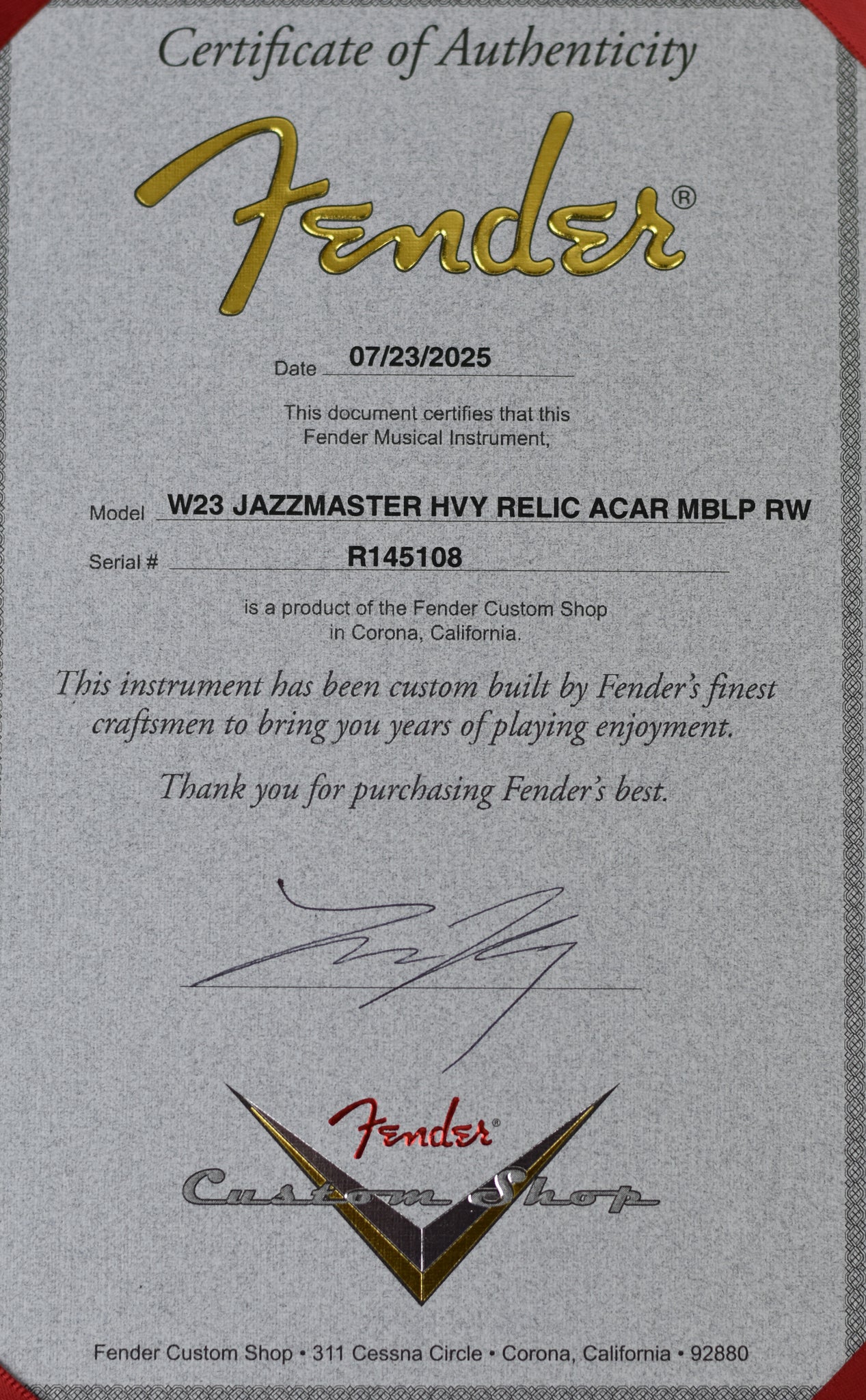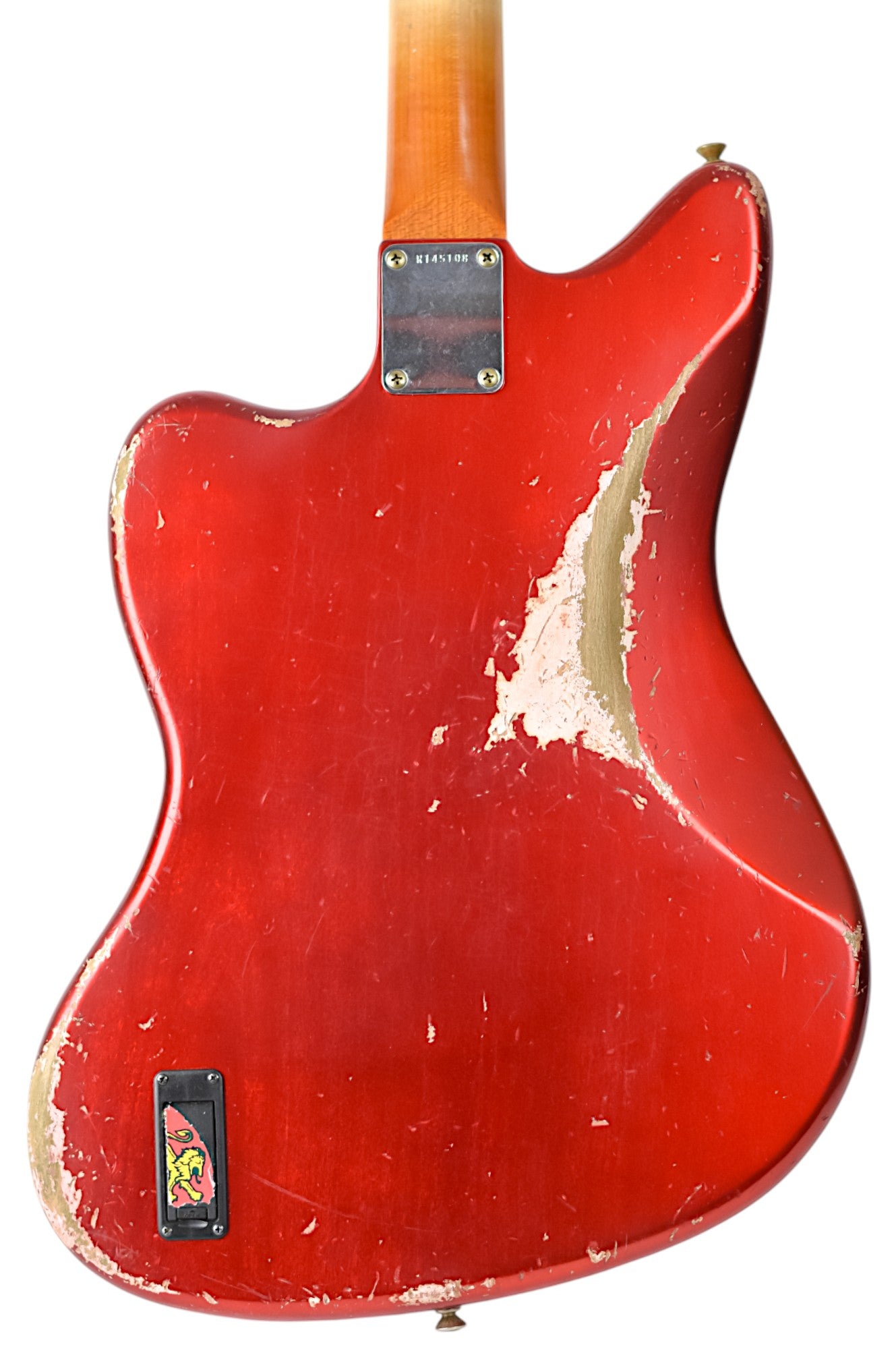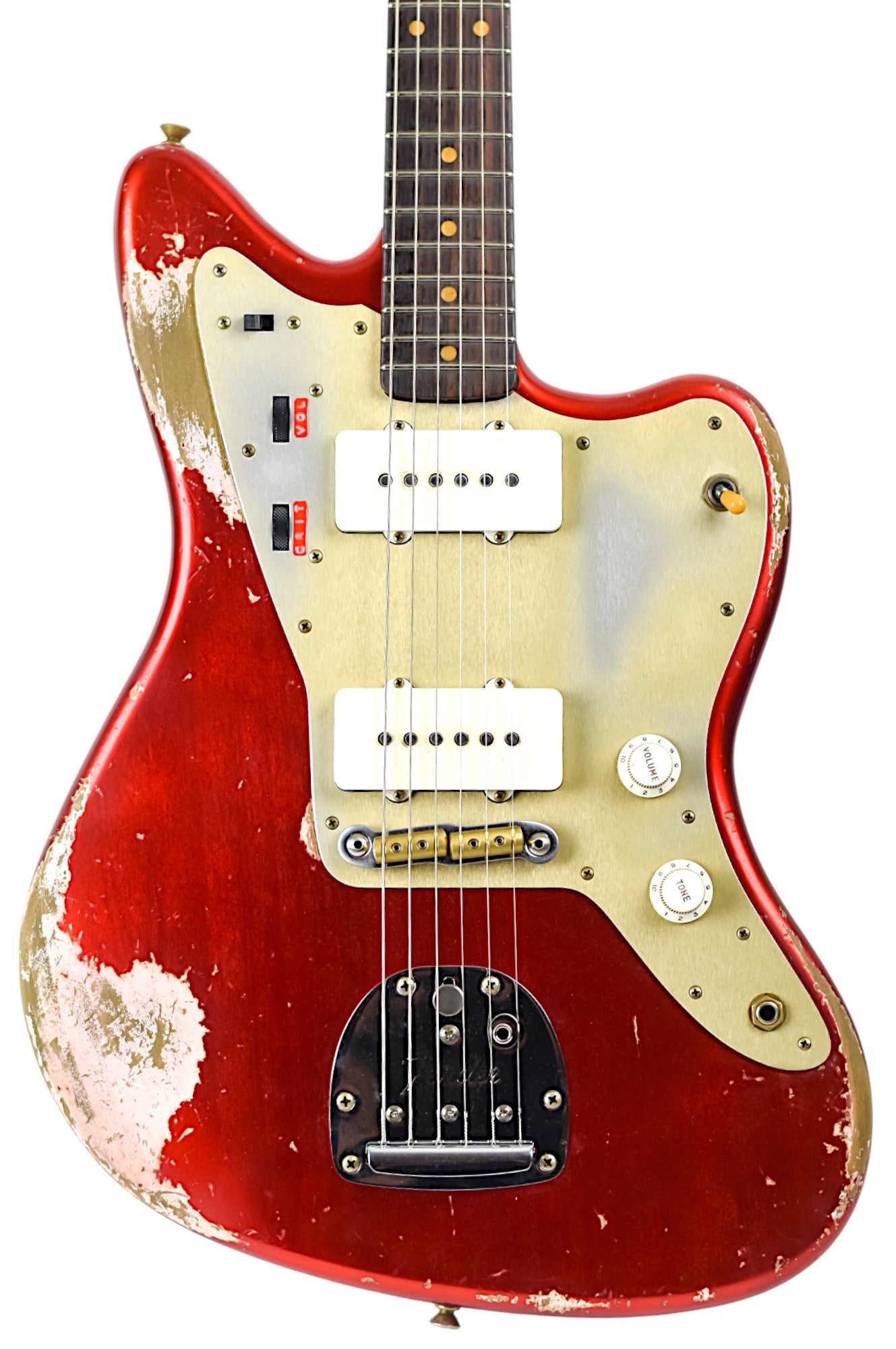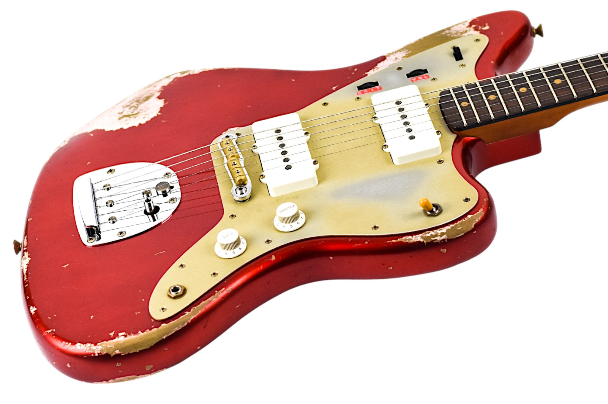 Freshly inspected and set up in-house by our esteemed Guitar Tech. The Aged Olympic White headstock overlay is a super cool look along with the Aged Candy Apple Red body. Did we mention the pickups are hand-wound by the legendary Josephina? This guitar also has custom electronics. The Jazzmaster Rhythm Circuit has been replaced by a Fuzz Circuit with Volume & Grit controls. Yet another gem from the bench of Master Builder Levi Perry. See below for more details and specifications.