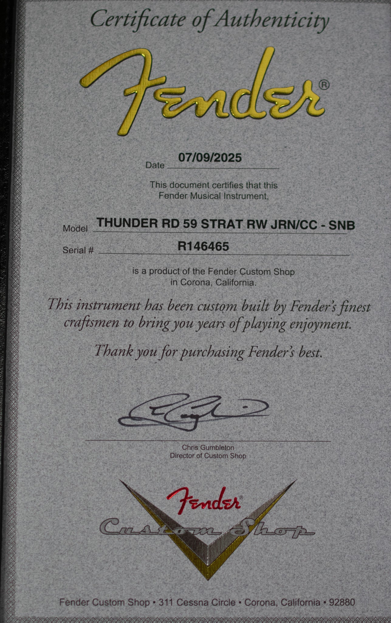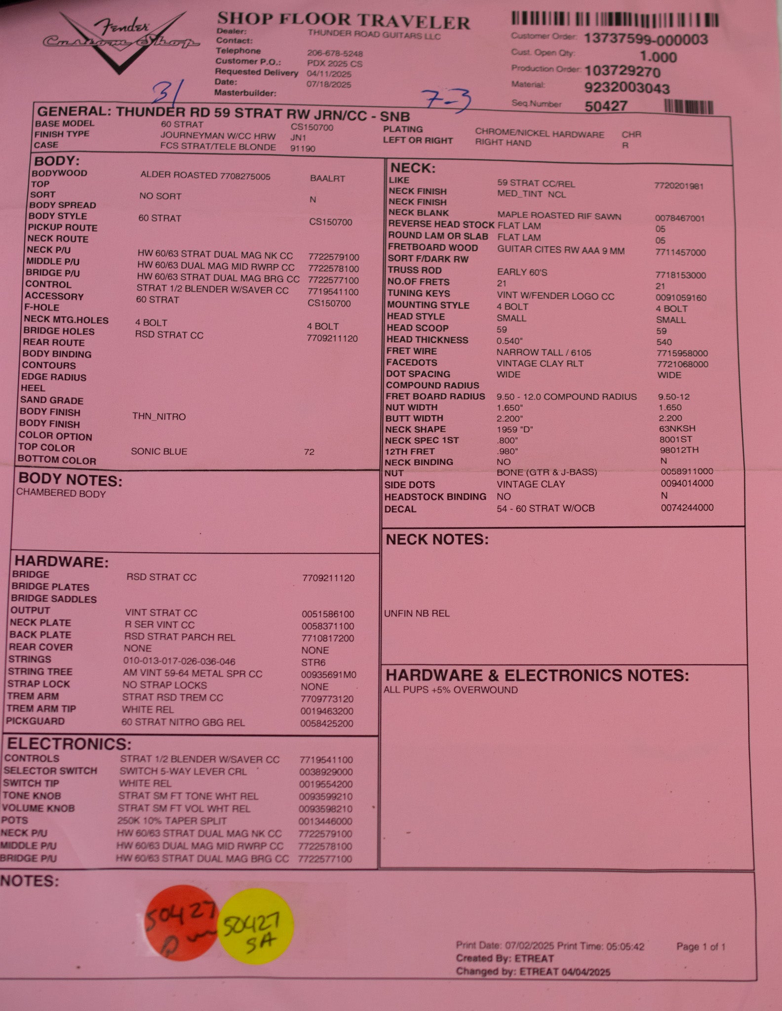 Each Thunder Road 1959 Stratocaster features a light-weight chambered roasted alder body, hand-wound pickups that are slightly overwound to our specs, closet classic hardware, Custom Shop Exclusive RSD bridge, roasted rift sawn maple neck and a compound 9.5-12" fingerboard radius. We love these guitars and think you will too! If you are after a light-weight resonant Strat that has the look and vibe of a vintage guitar with some modern specs this is the model for you!