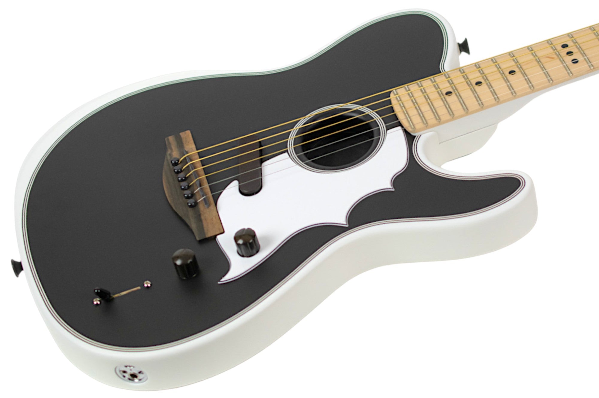 Built with premium tonewoods including a braced solid spruce top, an alder body, and maple neck and fingerboard, this Acoustasonic is crafted to deliver a truly premium acoustic-electric sonic experience. Other signature details include a satin finished Arctic White neck and body with a black top, a distinct custom 3-ply pickguard designed by Jack, a custom Jack White neck plate, triple dot inlays at the 12th fret, and black locking tuning machines. A deluxe molded hardshell case is also included to provide premium protection and security while traveling.