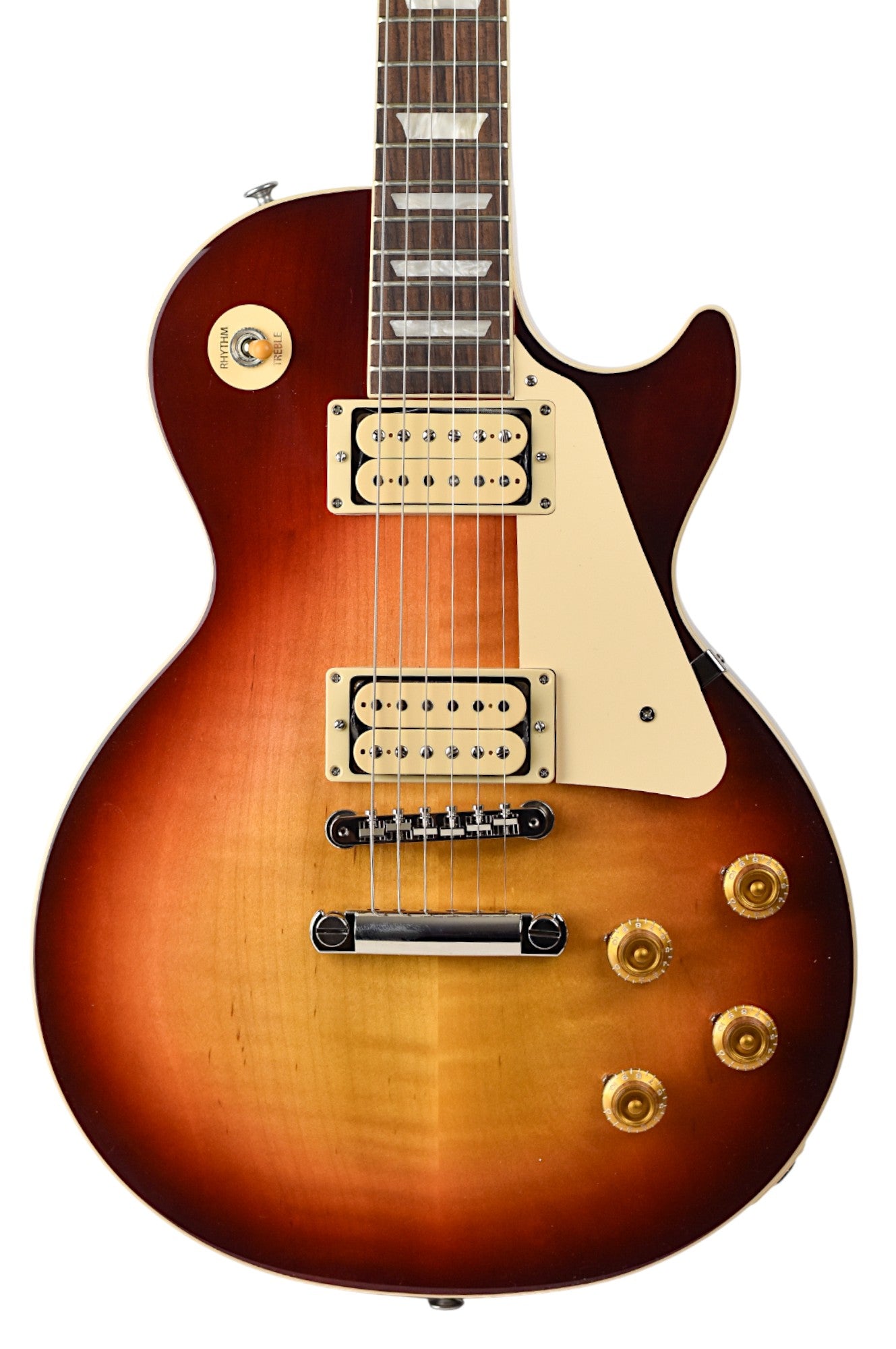 The second difference is in the finish. The finish colors are “Vintage” variations on our standard nitrocellulose lacquer finishes. Our standard gloss nitrocellulose lacquer finishes represent the finishes on brand-new models from the 1950s, while the full-gloss nitrocellulose lacquer Vintage finishes on the Les Paul Standard 50s Double Trouble models are slightly faded when compared to the standard versions, like the subtly faded light vintage aging that occurs over several years. The burst patterns vary somewhat from guitar to guitar since each is individually hand-sprayed.