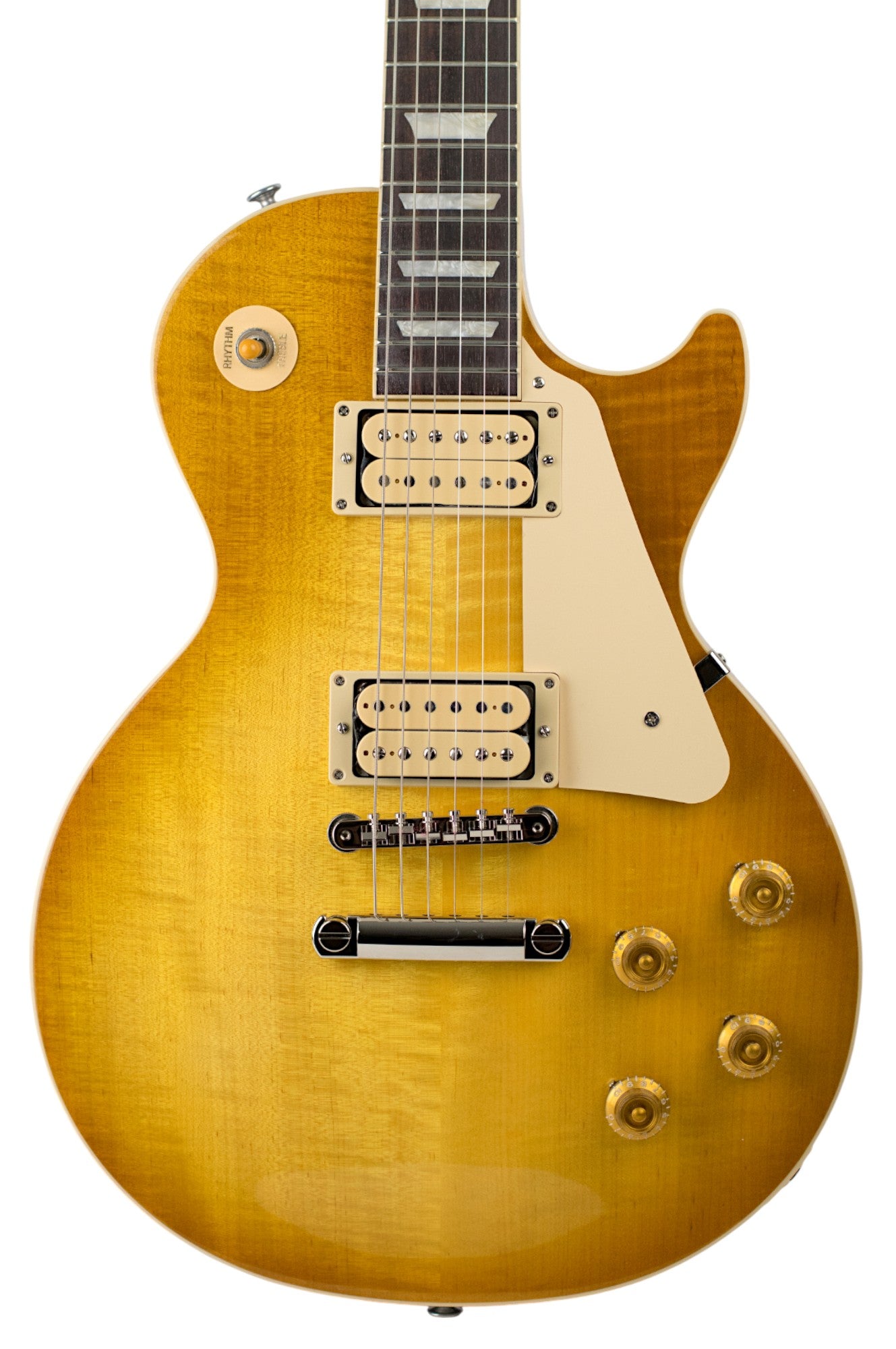 The second difference is in the finish. The finish colors are “Vintage” variations on our standard nitrocellulose lacquer finishes. Our standard gloss nitrocellulose lacquer finishes represent the finishes on brand-new models from the 1950s, while the full-gloss nitrocellulose lacquer Vintage finishes on the Les Paul Standard 50s Double Trouble models are slightly faded when compared to the standard versions, like the subtly faded light vintage aging that occurs over several years. The burst patterns vary somewhat from guitar to guitar since each is individually hand-sprayed.