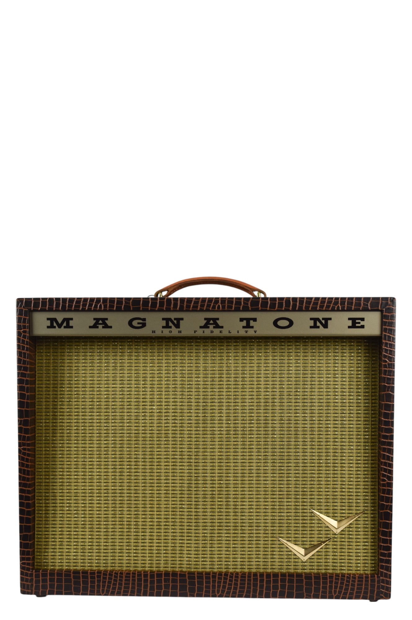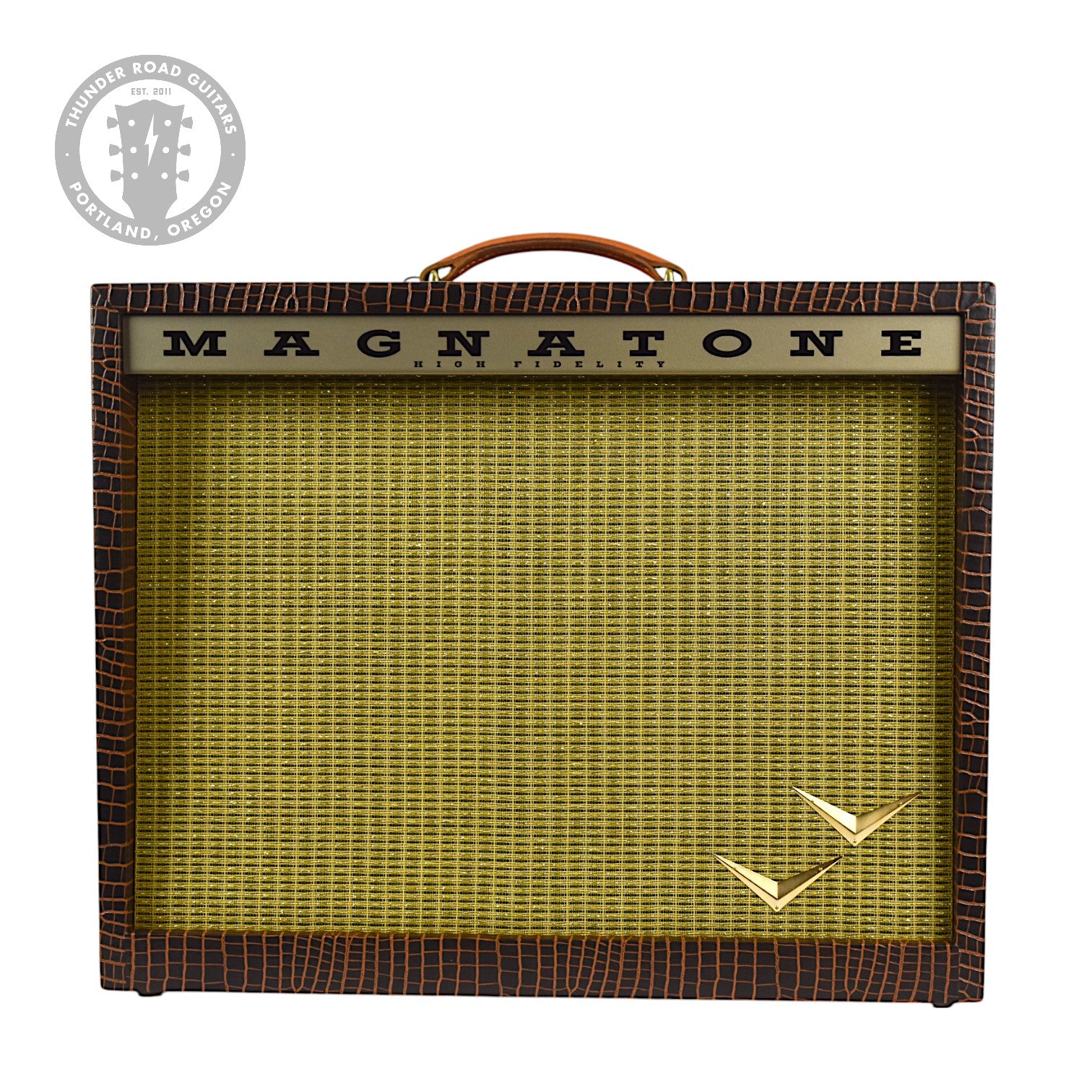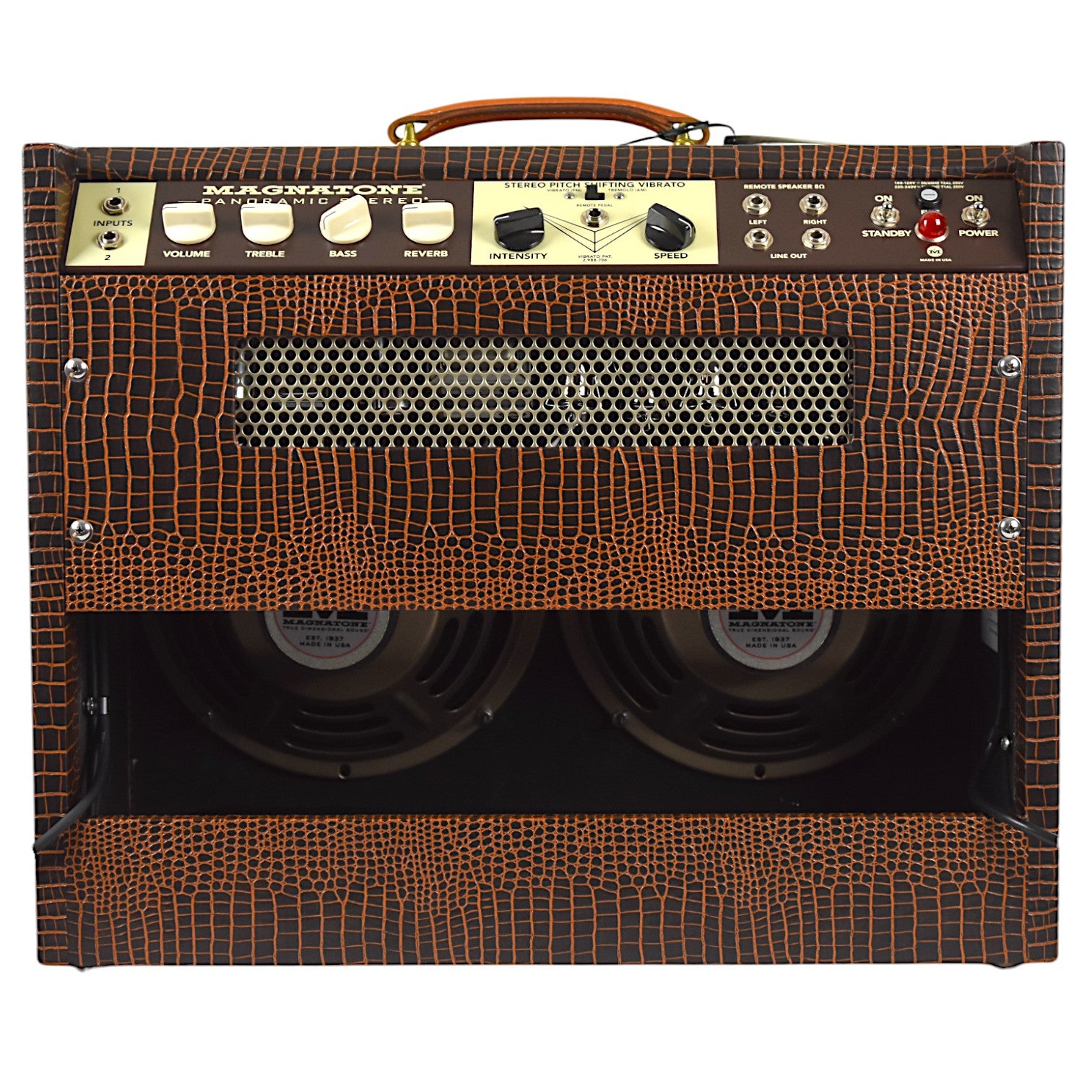A brand new Magnatone Panoramic Stereo Combo Amp. This amp is killer and comes in a Thunder Road Exclusive Brown French Alligator Wrap and a Gold Stripe Grillcloth. This amp looks absolutely stunning in person and sounds as good as it looks. See below for more details and specifications.