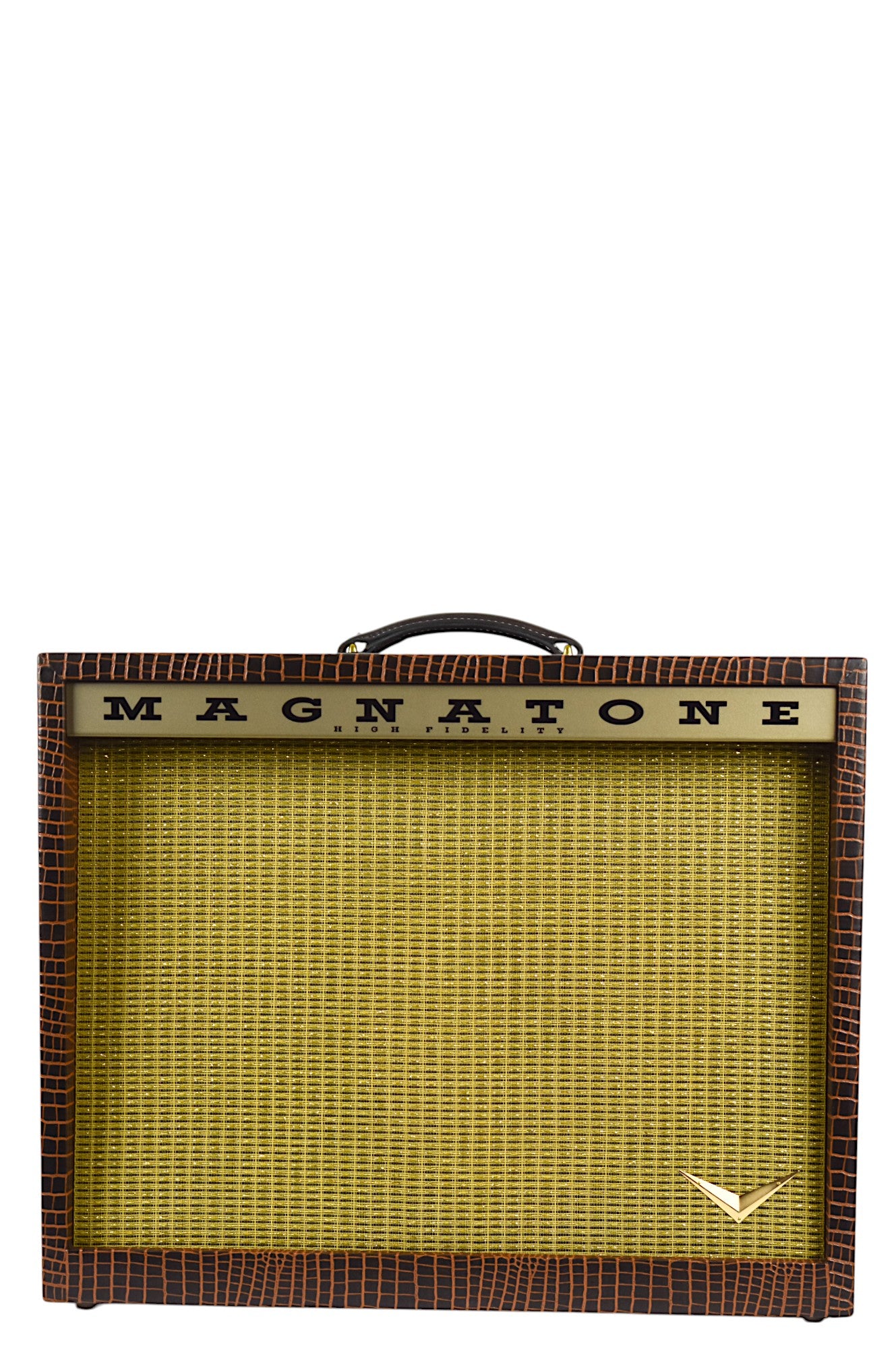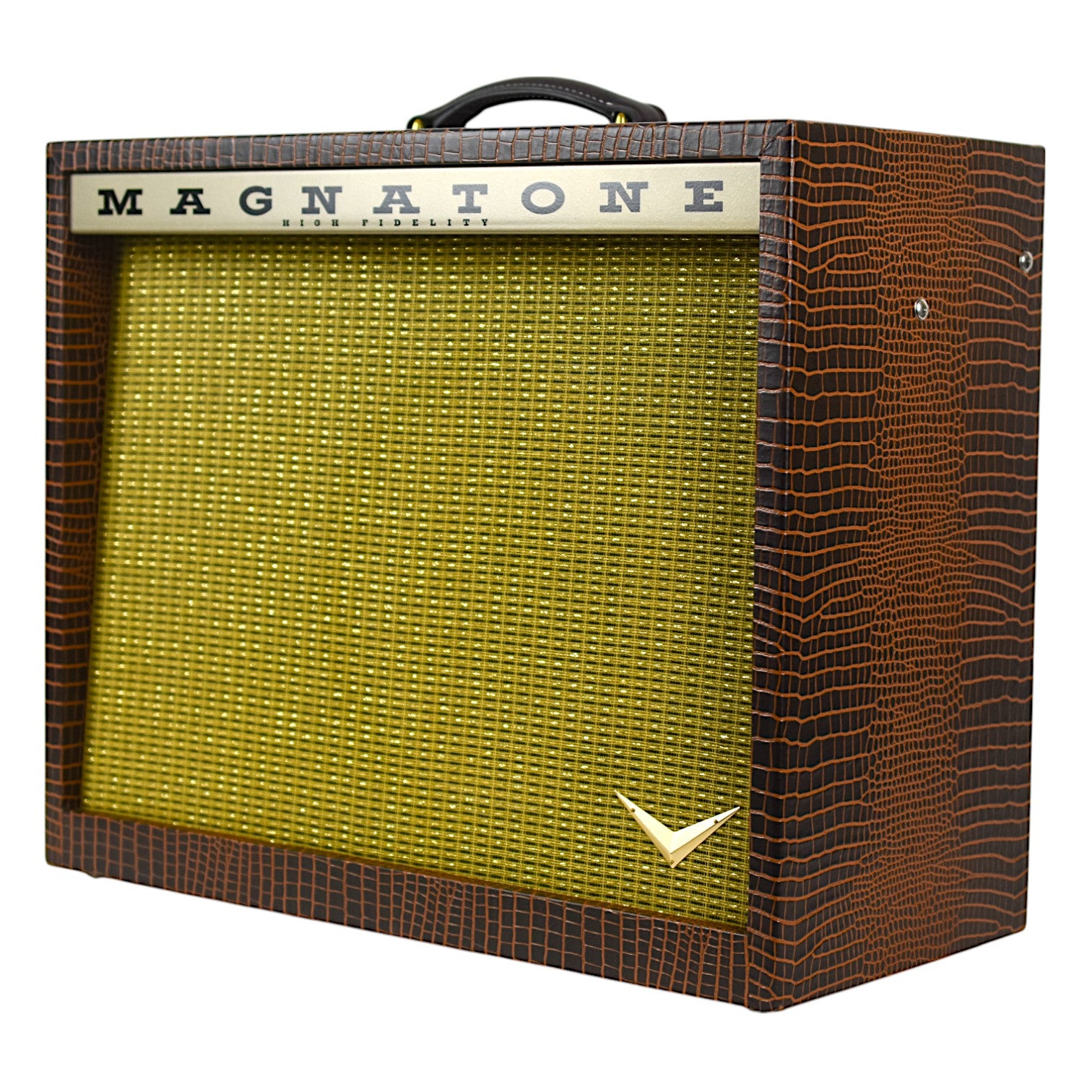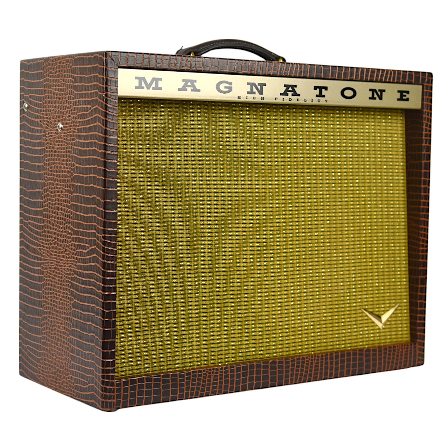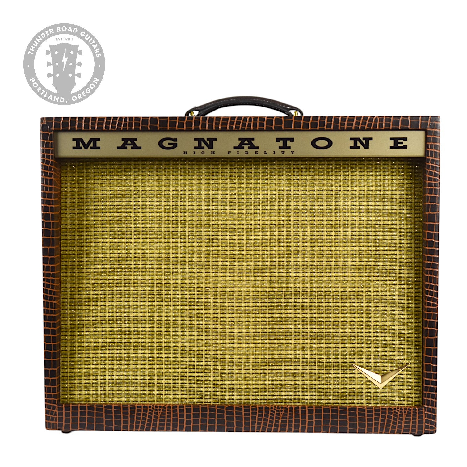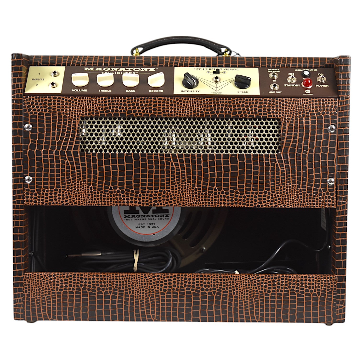 A brand new Magnatone Twilighter Combo Amp. This amp is killer and comes in a Thunder Road Exclusive Brown French Alligator Wrap and a Gold Stripe Grillcloth. This amp looks absolutely stunning in person and sounds as good as it looks. See below for more details and specifications.