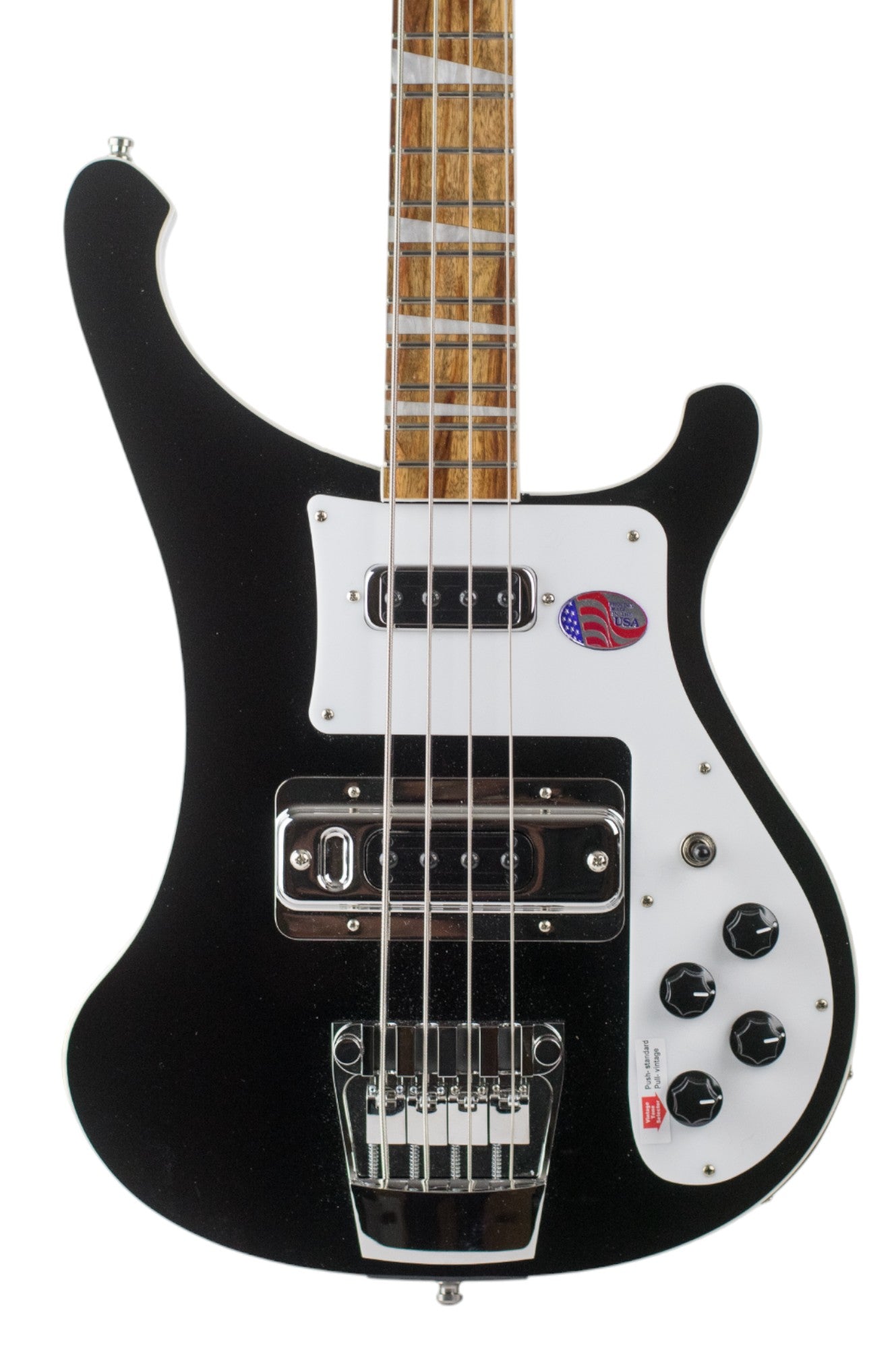 The Classic Rickenbacker 4003 bass – famous for its ringing sustain, treble punch and solid underlying bass. A subtle strip of binding graces the elegantly curved body and the Rosewood fingerboard. Deluxe triangular inlays and stereo capability are standard features.