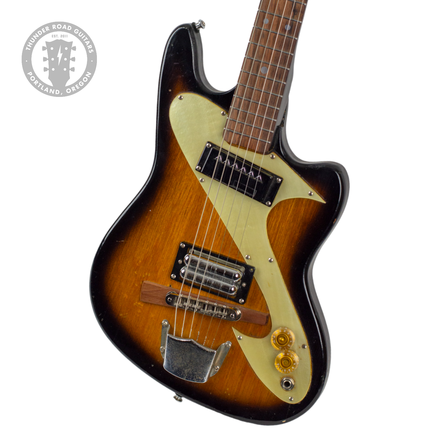 Freshly set up in-house by our esteemed Guitar Tech, this custom assemblage MIJ vintage electric guitar is dialed in and ready to go. Created by our friend and master luthier, Nate Wood, on a framework of MIJ parts. Lots of nicks, dents, scratches, tarnish, and other signs of being played. This guitar has so much mojo you'll never run out. If you're a fan of '60s and '70s MIJ guitars and don't give a hoot whether they're "all-original" but just want to enjoy the vibe on a nice playing and cool sounding guitar, this one could be for you.