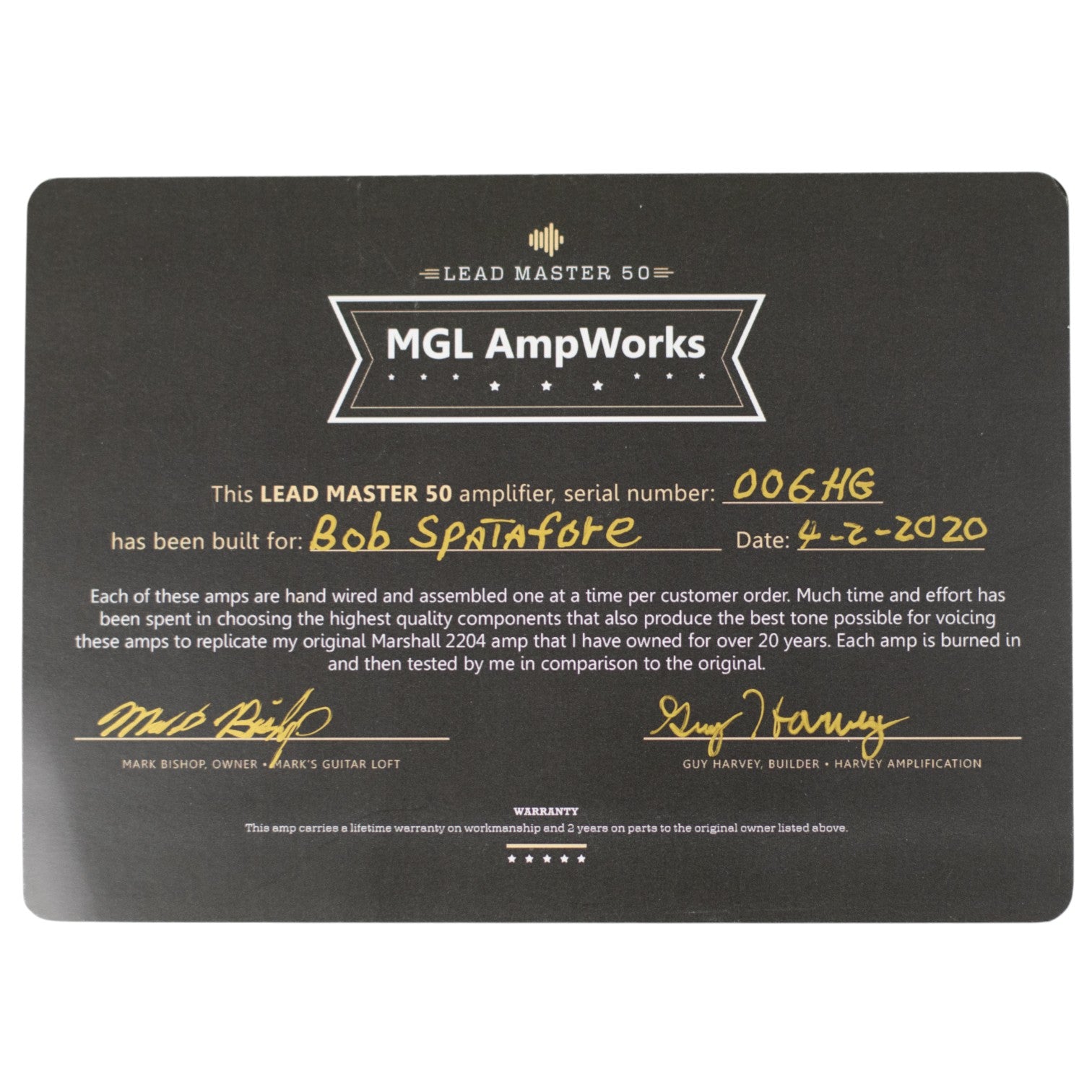 The Lead Master 50 is a boutique, hand-built 50-watt tube amp designed to deliver classic Marshall JMP/JCM800 2204-style tones with modern enhancements, higher gain capability, and exceptional build quality. It delivers "raw power and tonal complexity" reminiscent of vintage Marshalls while offering more gain without pedal boosting. The master volume is highly usable at low volumes and excels when cranked. Hand-built boutique pedigree, not a mass production item—units typically custom ordered or released in small runs